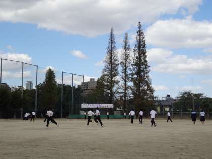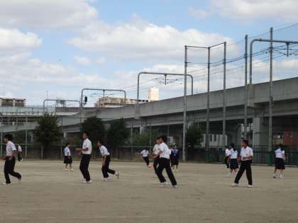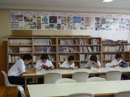台風一過の7日昼休み、運動場では青空のもとでサッカーやバレーボールで汗を流す生徒の姿が見受けられます。また、ボランティアの方々の協力で開館している図書館では、1年生が本を読んでいます。