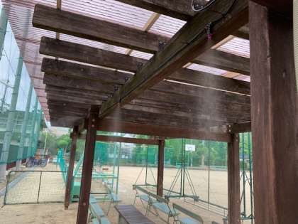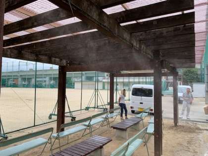 残暑厳しい日が続いています。学校では熱中症対策の一環として運動場の元藤棚に夏休み期間を利用してミストシャワーを設置しました。