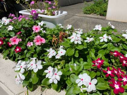正面玄関には元気アップボランティアさんが当番で水やりしていただいている日々草が美しく咲いています。