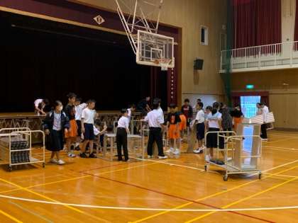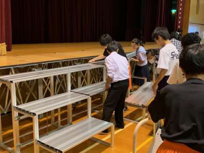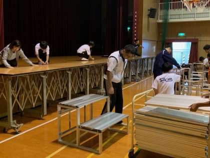 朝から、1年生の学級代表と体育委員、そして男子バスケットボール部員が、今日から始まる文化発表会の取組みの為に、張り出し舞台とひな壇を設置しました。