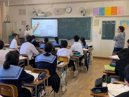 英語科の先生と一緒に授業を行い、生徒たちへ英語への興味・関心を高めていただいています。