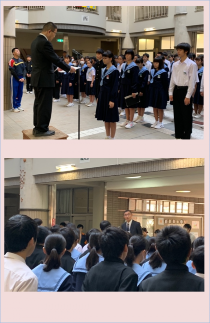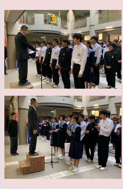 昨日行われた阿倍野区親善中学生駅伝の表彰を、男女それぞれのチームで行いました。続いて、「税についての作文」で、3年生の大平さんが受賞した「近畿税理士会阿倍野支部長賞」の表彰しました。