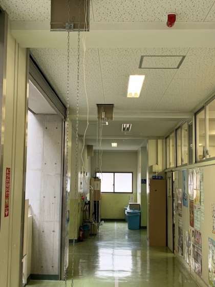 各部屋・廊下にある全ての火災報知設備・非常警報器具が正常に作動するか、煙りを感知した場合に1階から4階までの吹き抜けを囲うシャッターが正常に動くかを点検してくださいました。
