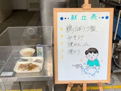 今日の給食メニューは、鶏ごぼうご飯・焼きれんこん・みそ汁・焼きのりと牛乳でした。ご飯の上に鶏ごぼうの具材を載せて美味しくいただきました。