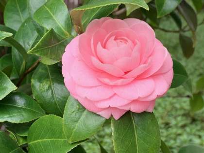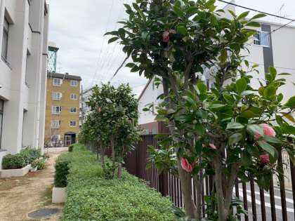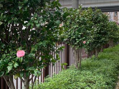 校舎北側に沿って、乙女椿が植わっています。八重の豪華なピンク色の花を次々に咲かせています。花言葉は「控えめな美」だそうです。