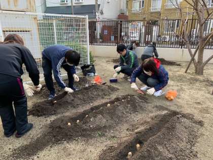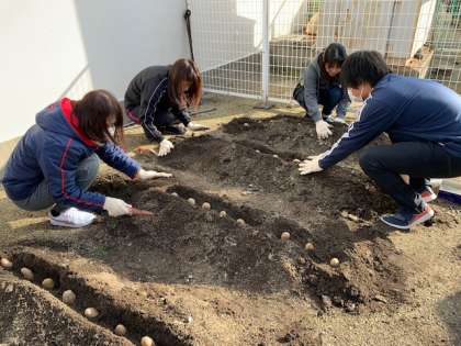 学校元気アップコーディネーターさんのご指導のもと、ジャガイモの種芋を植えました。本来なら、ふれあい委員の生徒が植えるところを先生たちで植えました。育ったジャガイモは恒例の夏野菜カレーの具材として振る舞われます。