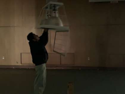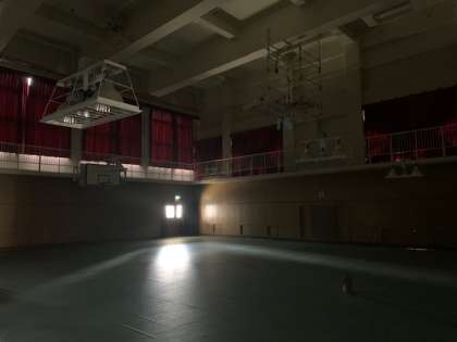 卒業式場となる体育館の天井照明を換えました。ボタン一つで器具ごと床付近まで自動で下がってきます。