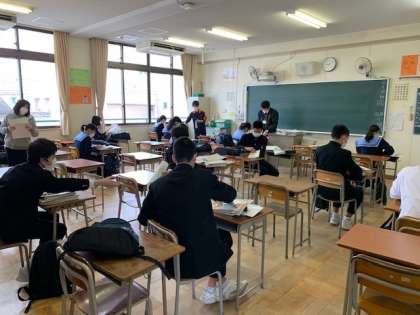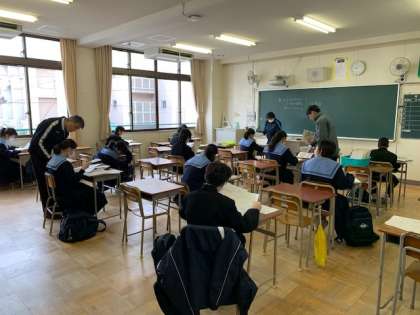 1年生と2年生の各クラスを、9時登校と10時30分登校の2つに分け、席を市松模様のように配置して、教室を換気しながらテストを返却しました。