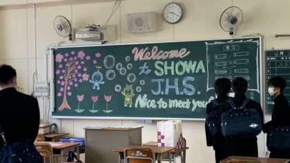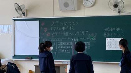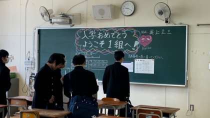 各教室の黒板に書かれた担任の先生のメッセージが、温かく生徒たちを迎え入れました。