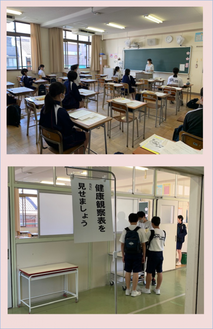 約3週間ぶりの登校となり、健康観察表での確認や検温して教室に入りました。クラス半分の人数なので、市松模様になるように座席を配置して、学活と身体計測を行いました。