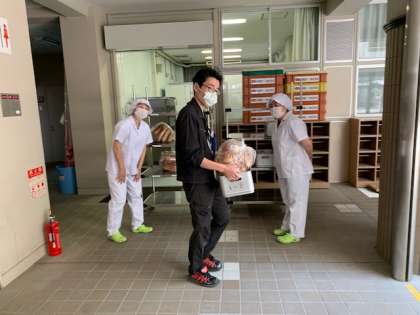 6月1日から簡易的な給食が始まり、先生が手分けをして配膳しています。