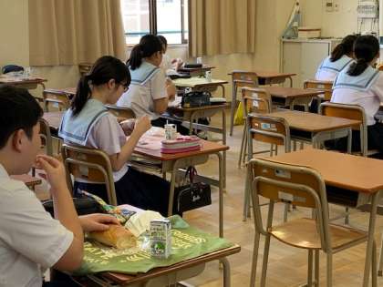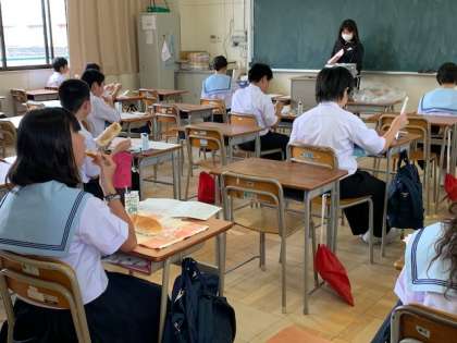 前を向いたままの食事ですが、先生の面白い雑談等を聞きながら、笑顔で食べていました。