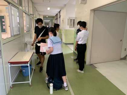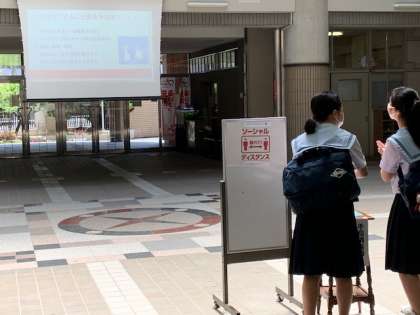 新しい学校生活スタイル(マスク着用、手洗いの徹底、3密を避ける)とソーシャルディスタンス(社会的・身体的距離の確保)を意識した行動を生徒にも伝える一方で、物理的距離が離れていても、一人一人の心は繋がるように取組んでいます。
