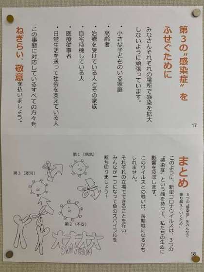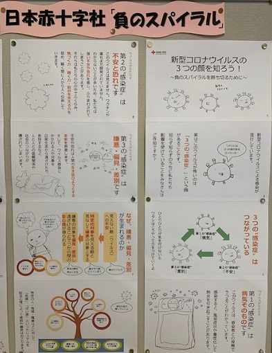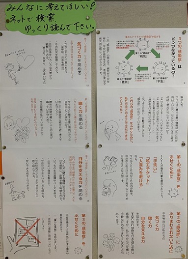 保健室の掲示板に、新型コロナウイルス感染症への対応策と心構えが詳細に示されています。コロナウイルスの特性を生徒に正しく知ってもらい、正しく恐れる行動をとってもらうためです。