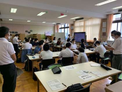 本校は「ICT活用事業」拠点校であり、タブレット端末が一般校よりも多く導入されているため、平野区・東住吉区の小・中学校の先生の「Teams」活用研修の会場となりました。