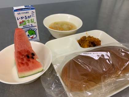 夏の風物詩「すいか」がメニューに入っていました。90%が水分のため夏の水分補給に適した果物です。かぼちゃのミートグラタンと鶏肉スープも美味しくいただきました。