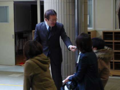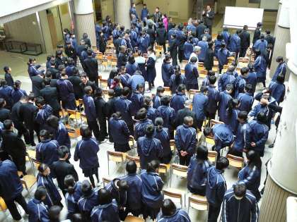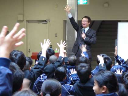 休憩後は、じゃんけんや目をつぶって歩く動作も入り、ちょっと手狭なピロティーでしたが、生徒もよく参加しました。