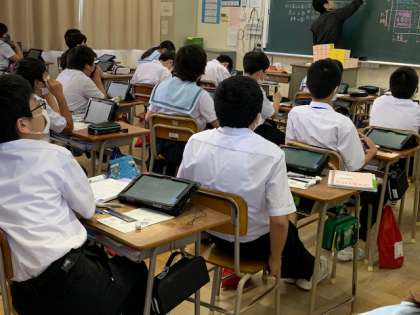 タブレットを使う学習は、各自が自分のペースで確認でき、個に応じた学びを促しています。