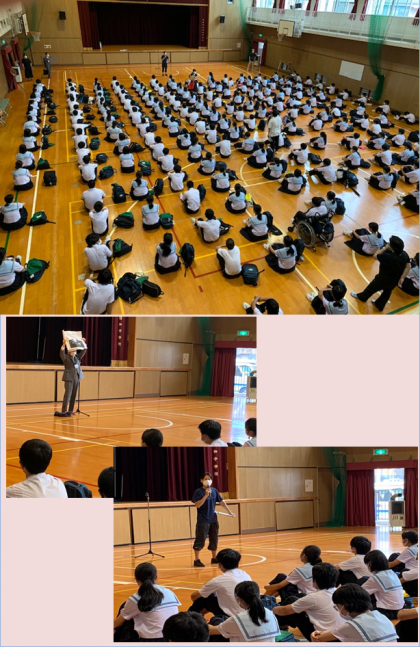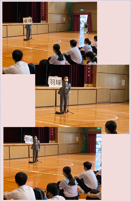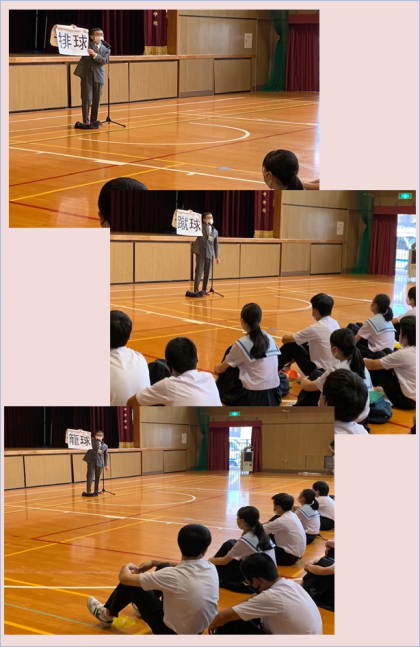 校長先生からは、球技種目のスポーツの漢字を掲げながら、生徒と質問形式で話を進め、元全日本代表で、前バレーボール全日本女子チーム監督の柳本晶一さんにまつわる話がありました。技術・体力の向上だけでなく、人間力を高めることが一流選手の条件であることを話されました。
