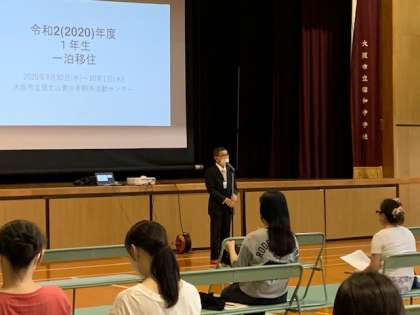 一泊移住保護者説明会を開催しましたところ、在籍93名中56人の保護者の方が来校してくださいました。例年ならばエアコンの効いた多目的室で行うところ、密を避けるために空間の広い体育館で実施させていただきました。