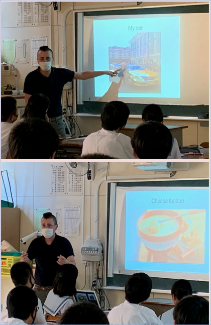 出身地や趣味などの自己紹介を画像に写しながら大きな声とジェスチャーで、元気ハツラツと授業をしました。