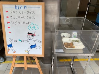 今日の献立は、子どもたちの好きなチキンカレーでした。そこにきゅうりのピクルスとぶどう(巨峰)が付いていました。