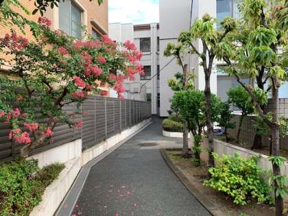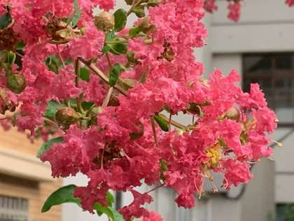 百日紅(サルスベリ)の花が、ピンク色の小さい可愛い花をたくさん咲かせています。漢字名のとおり初夏から秋までの長い期間花を咲かせています。また、サルスベリと言う名の通り、サルでも滑りそうなほどツルツルとした幹にちなんでつけられました。
