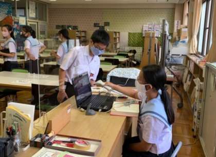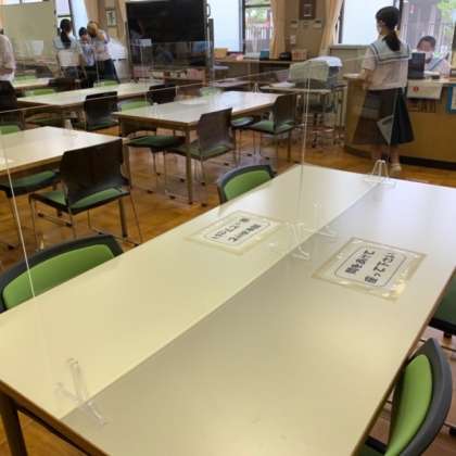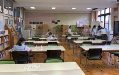 毎日の昼休み、学校元気アップボランティアさんが当番制で図書館の開館をしてくださっています。そのおかげで昼休みの読書を楽しみにしている生徒もいます。本を読むことは知識だけでなく心もひろがり、様々な心情の機微にも触れることができます。中学生時代にたくさんの本との出合いは大切です。また、コロナ対策で机の真ん中をアクリル板で仕切っています。