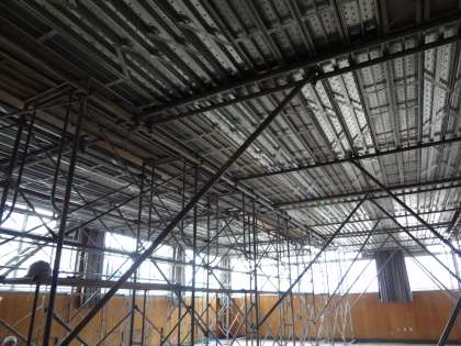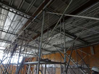 体育館に続いて、武道場の天井工事が始まりました。写真は、足場が組まれた武道場のようすです。2月中旬くらいまで工事が行われる予定になっています。剣道部の練習はその間、トレーニングが中心になります。