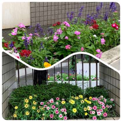 玄関の花(ジニア・ブルーサルビア・日々草・ペンタス)は雨に打たれて、生き生きと輝いています。