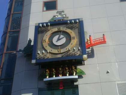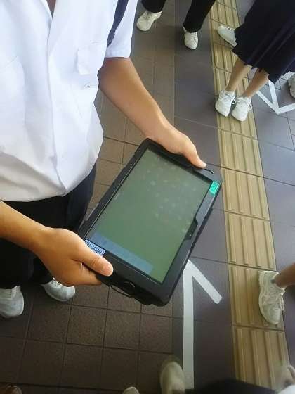 班別の散策に行ってきます。記録用のタブレットを持参しています。いくつかの班は、はりまや橋交差点のからくり時計に迎えてもらうことができました。
