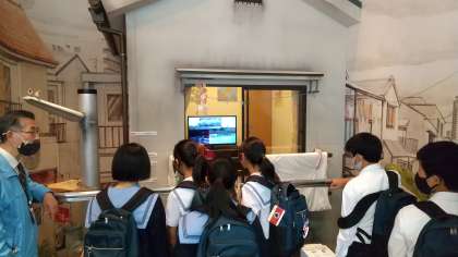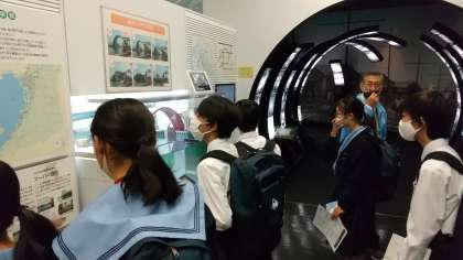 津波・高潮ステーションは阿波座駅を降りてすぐのところにある、地震や津波について学べる施設です。リアルな展示や迫力ある映像を通して災害を身近なものとしてとらえ、来るべきときへ備えの大切さを学んでくれたのではないでしょうか。訪れた3つの班はそれぞれしっかり施設の方の説明を聞き、見学していました。〔2年教員〕