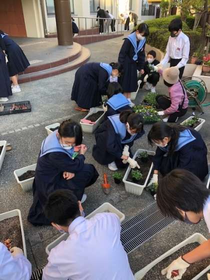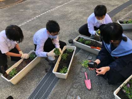 プランターに球根を5ずつ等間隔で埋め、その間に花の苗を植えていきました。生徒はすぐに要領を得て作業をお行いました。時々球根が顔を出してしまい、また埋めなおす場面もありました。1・2年生にとっては他学年生徒と交流する一つの機会にもなり、3年生にとっては実力テスト後の気分転換にもなったのではないでしょうか。(ふれあい担当教員)