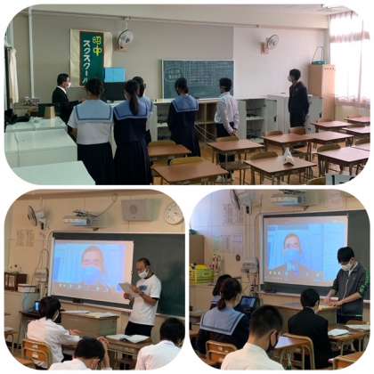 「Teams」を使ったオンライン集会を、クラスごとに教室で実施しました。