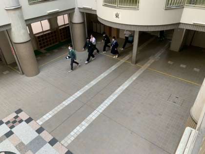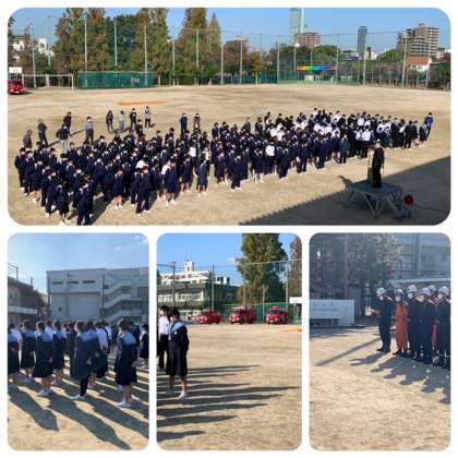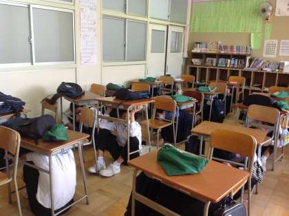 非常ベルとともに緊急放送が入り、一斉に机の下に頭を守りながら身を隠しました。