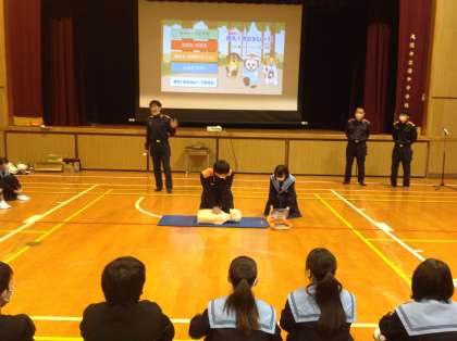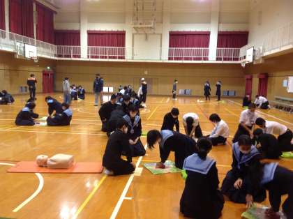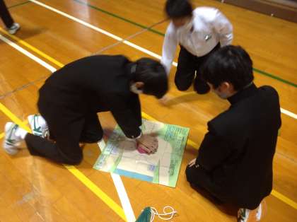 消防署の方から心肺蘇生法について教えていただきました。2〜3人ずつのグループに分かれて心臓マッサージのトレーニングもしました。