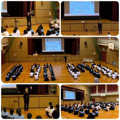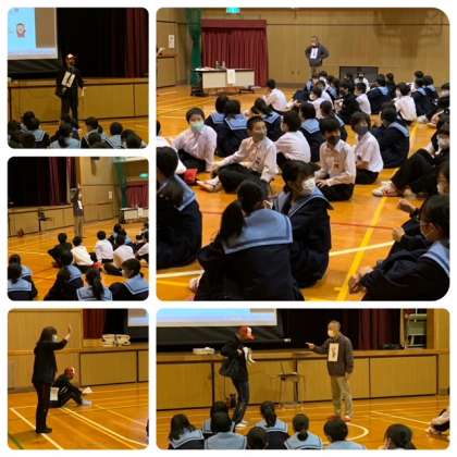ハローワーク阿倍野の山城様をお招きして、職業についてのお話をしていただきました。自分の好きな職業に就くために今できること、中学生の時に何をすればよいかをプロジェクターを使いながらわかり易く説明をしていただきました。
