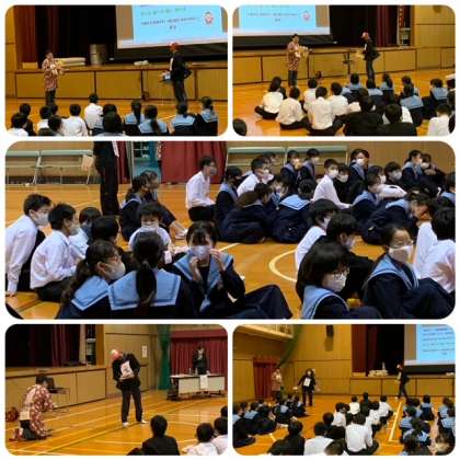最後は、生徒・先生・クラスメート・お母さんに扮した先生が、中学校生活での勉強の大切さを劇で表現しました。生徒は笑いいっぱいで大喜びでした。