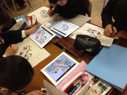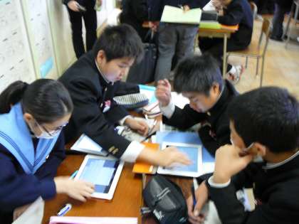 1年2組の家庭科の公開授業の様子です。「快適に住まう」をテーマに、安全な住まいについてグループで考えをまとめ、Schoologyで共有しています。