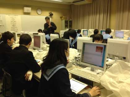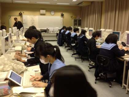 3年1組は、学校の「ホームページの作成」を行いました。タブレット端末の電子マニュアルや色彩アプリを活用し、HTMLで卒業論文を作成しました。