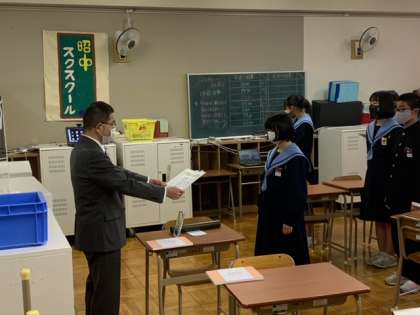 PTA夜間巡視ポスターコンテストの結果、1年生の西村さんの作品が最優秀賞に選ばれ、表彰状とともにクリスタル盾を授与しました。応募者全員には参加賞をいただきました。