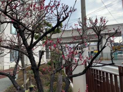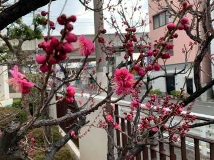 玄関の紅梅も一輪の花が咲いてからちょうど一週間が経ち、一分咲きほどに花がちらほら開花しました。一歩一歩春が近づいています。
