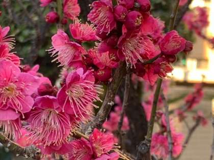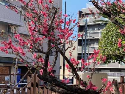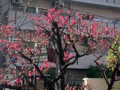 玄関の紅梅がここ1週間で急に咲き始めました。「紅梅」の花言葉は、「あでやかさ」です。紅花の美しく、華やかな姿からつけられたそうです。紅花は、平安時代の女流作家・清少納言が愛した花とされ、随筆・枕草子には「木の花はこきもうすきも紅梅」という句が残されています。