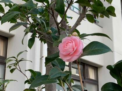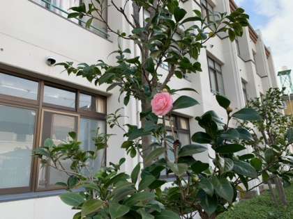 校舎北側に並ぶ乙女椿が一輪、まるい花びらを重なり合わせて美しく咲きました。清楚で可憐な魅力に満ちた、とても美しい花です。