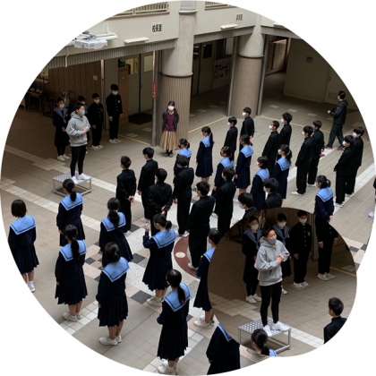 毎週水曜日は2年生の学年集会の日です。どの学年も人数が少ない為、ピロティーで実施できます。
