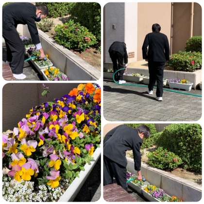 毎日、ふれあい委員の生徒が当番制で花の水やりをしてくれています。春の日差しを浴びて、鮮やかな色合いでパンジーやアリッサムが咲いています。