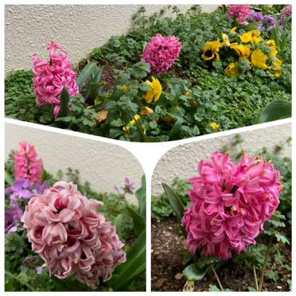 玄関に咲くヒヤシンスと黄水仙(すくすくガーデン)