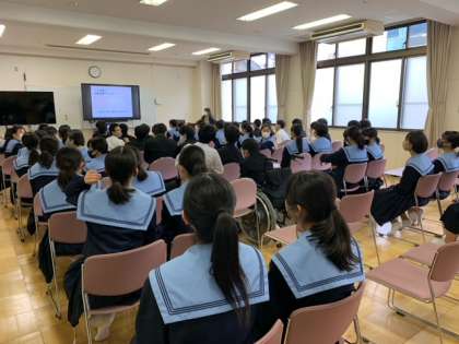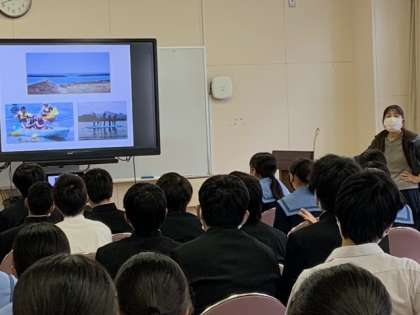 生徒も初めての説明を聞き、気持ちも旅行気分に高まり、周囲の人と会話をしながら楽しく話を聞き入っていました。宿泊地のホテルの美しさに拍手が沸き起こっていました。