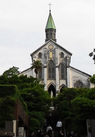 集合場所の前に聳える大浦天主堂。青空に映えて、とても美しい