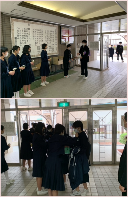 登校してくる卒業生に対して、玄関で生徒会役員が別れ惜しそうに一人一人にコサージュをつけています。